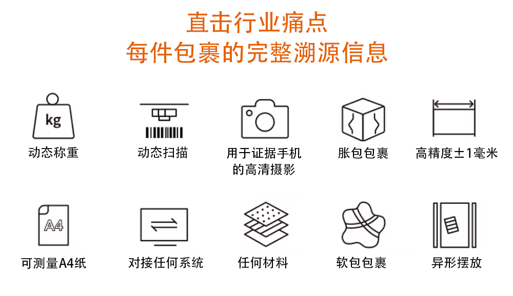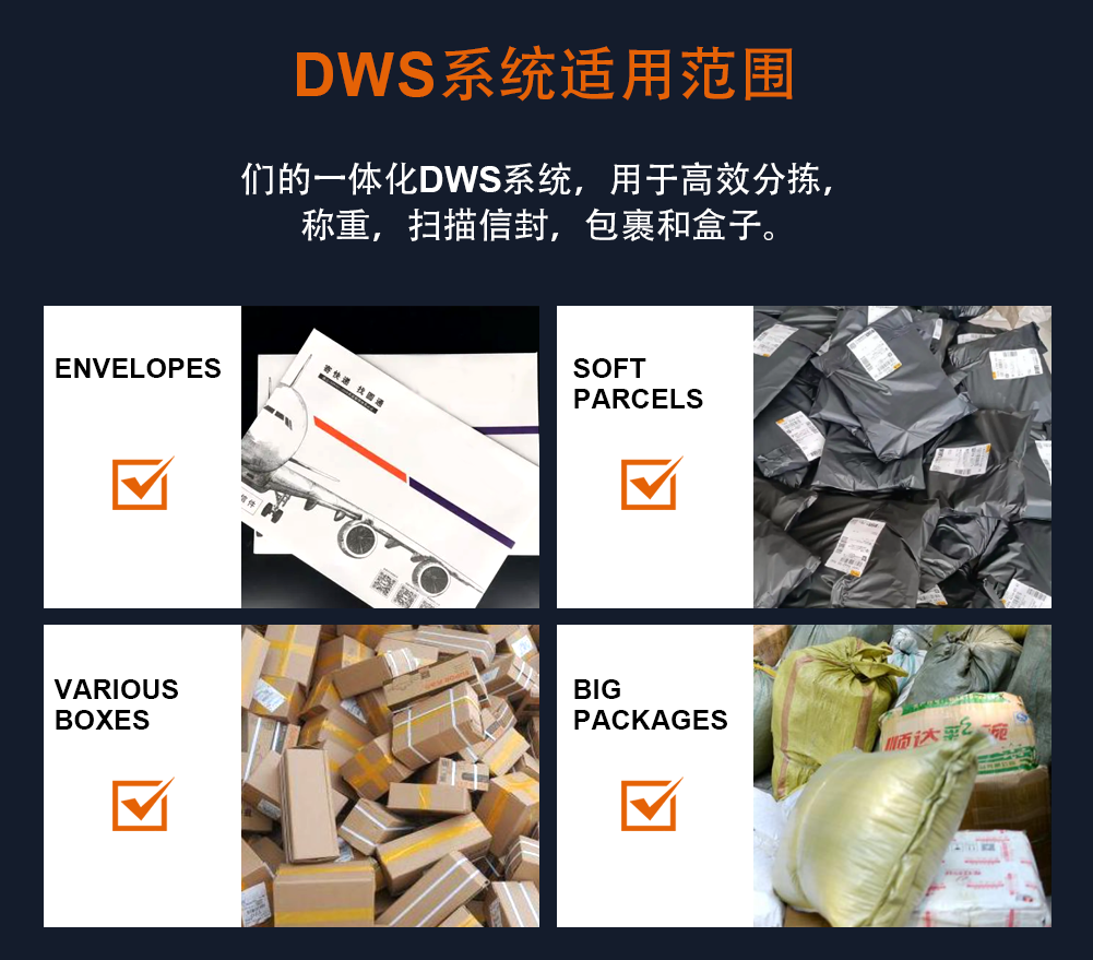 DWS(尺寸,称重,扫描)系统,旨在彻底改变物流和快递业务的范围广泛的包裹,包括信封,软包裹,各种盒子,甚至大包裹。这种创新的系统简化了分拣和处理过程,提高了每一步的效率和准确性。